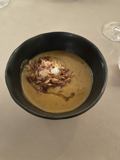 Read moreAussitôt arrivés le chef des lieux sait mettre à l'aise et accueillir chaleureusement ses convives. Nous sommes venus en couple, nous avons eu une jolie table soignée un peu à l'écart. Ce qui est surprenant au départ, c'est qu on ne propose pas de carte, on ne choisit pas, on est tout simplement invités à se laisser porter par le menu dégustation très raffiné et les vins idéalement sélectionnés pour s'accorder à chaque plat. Notre hôte attentif nous demande si nous avons des allergies ou des aversions pour des ingrédients. Très vite, on parvient à se laisser porter par ce voyage culinaire de haut vol. Ce qu'il y a aussi d'intéressant dans ce concept c'est de ne pas avoir son cerveau régulièrement accaparé par le choix des mets ou boissons. Finalement nous sommes en amoureux et nous pouvons échanger, se regarder dans les yeux, sans se préoccuper de rien. Un service très agréable et efficace. Une expérience très relaxante selon moi. Dans le menu du soir nous avons 4 plats surprise prévus : 2 entrées 1 plat chaud et 1 dessert. L'équilibre des saveurs est bien là, j'ai mangé des aliments tels que du salsifis et du fenouil (que je n apprécie pas particulièrement à la base) mais qui s'harmonisent parfaitement aux autres saveurs du plat en question. La note d' épices est comme un fil rouge dépaysant tout le long de cette dégustation jusqu'au dessert. Bref j'ai passé un moment inoubliable qu'il me tarde de renouveler car le chef conçoit ses menus au gré de ses trouvailles...