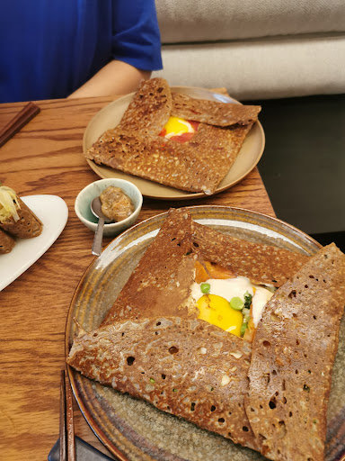We liked and shared all of our galettes, and the sauces were delicious . I particularly liked the one that goes with the asparagus, and the fried encornets, while a little salty, were scrumptious (and strangely evocative of andouille de GuĂ©mĂ©nĂ© or andouillette) . On the whole we felt the salty galettes were the highlight of our meal . The sweet crĂȘpes are really good, but not as addictive and memorable. As for the drinks, the cider from LouvignĂ© was a success, we loved it. Coffee is served with a small bite of spongy macha flavoured cake that is the perfect end note . It was well worth the price, and i highly...