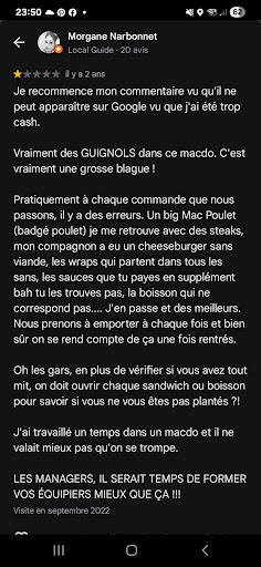 Jâose espĂ©rer que lâĂ©quipe McDo va me rĂ©pondre, je ne veux pas dâexcuse, je ne veux mĂȘme plus de geste commercial, seulement que le management de votre Ă©quipe soit faite pour quâun lieu de restauration rapide joue son rĂŽle. Câest pas comme si en Prod ça ne sâallumait pas en rouge quand une commande est passĂ©e depuis un moment...