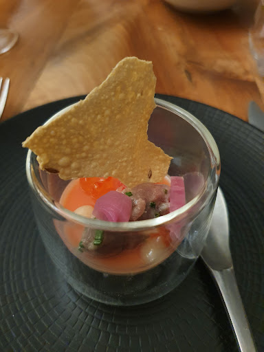 Read moreMenu Dégustation Un regal des papilles : ces mélanges de saveur, du croquant, du fondant, cette fraîcheur ... La raviole de rouget et langoustine nous a un peu moins enchantés : liaison entre les différentes saveurs moins réussie. Le dessert est à la hauteur des entrées. Le repas était magique, ensoleillé, dommage qu'un nuage ait apporté une petite déception : le magret est excellent mais, la part nous a semblé ridicule, deux tranches de plus auraient été les bienvenues . Effectivement, c'est un menu découverte, sans cette petite déception , cela aurait été merveilleux... Menu Au fil des saisons C'est un plaisir des yeux et du palais du début à la fin. Petit bémol : malgré un très bonne cuisson, le poulet n'était pas très goûteux : on n'aurait pas dit qu'il soit fermier. (???) Conclusion Toujours très bien reçu à L'Alto. Quel que soit le menu, le chef vous régalera de couleurs saveurs et textures... En ce qui me concerne, à moins que le chef ne décide de faire une part un peu plus généreuse sur le plat principal du menu dégustation, je me contenterai du menu Au fil des saisons. Bon appétit à...