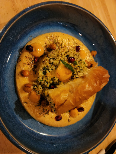 As the food came out it became apparent that the chef had over complicated things and the food just wasn't up to standard I'm afraid. Neither rustic french or fine dining, it was in the middle and lacked identity, authenticity and deliciousness. Numerous things were not right including a broth with no backbone, falafel that didn't have that lovely crunch and then soft texture inside, a kebab that was presented neatly but would have been better executed at a decent kebab shop at 3am after a load of drinks (needed fat and love), a "cheese" dessert which was hilarious - a big dollop of blue cheese, bowl of lettuce (just lettuce) and a tiny brioche with something on top. I had the baked cheese cake which lacked any life whatsoever as I attempted mouth to mouth to bring it back. I ate 1/3 of it and had to stop. We were hungry afterwards and had to go and find food which is really sad.