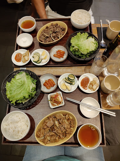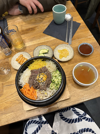 A wonderful little gem of a restaurant. We ate there this evening and had a great meal. I went in not knowing much at all about Korean food and the waitress was very helpful with explaining how to eat things. The food was delicious, but hard to describe. It came out looking super fancy with all the little dishes and sides, but the flavours were so down to earth and wholesome. Nothing overwhelming. Nothing too rich. Nothing greasy. Just good, clean, well-balanced soul food, with a great mix of textures and flavours. I had the dolsot bibimbap and it was delightful. Unfortunately I can't eat spicy food so my friend had to eat the little red noodle things, but I demolished everything else at record speed with much joy. He had the gogi with beef and chicken and said it was very good. He enjoyed that he could build each bite to taste different. And the dessert! Oh my gosh... I had the pancake dessert with the nuts and cinnamon and it was honestly like eating bites of the spirit of autumn. Absolutely delicious. My friend had the green tea cheesecake, which had less of a wow factor but was lovely and creamy, and he very much enjoyed it.