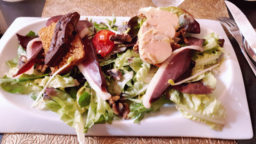 Hors de prix sans raison Lorsque nous sommes arrivés, il nous a été indiqué qu'il n'y avait qu'un seul menu ce soir là. Pas de souci pour nous. Mais de ce fait pas d'annonce de prix ni de carte. Nous ne nous sommes pas méfiés. L'assiette de l'entrée sortait du frigo, elle était gelée, il y avait encore la condensation sur l'assiette. De ce fait, tout son contenu etait tres froid, même le pain "grillé" ainsi que les 2 mini tranches de pain d'épices qui accompagnées les 2 tranches de foie gras. Puis vient le plat : c'était magret ou grande salade. Nous avons pris la grande salade : beaucoup de salade verte, quelques tomates, 2 tranches de jambon cru et une burratta. Aucun dessert ne nous a été proposé mais ça nous allait bien car nous n'avions pas très faim. La serveuse nous a aussi apporté une bouteille badoit toute poisseuse (pleine de confiture) et ne l'a pas ouverte (bouteille en verre avec capsule donc impossible à ouvrir sans outil). Le serveur a remédié à ce souci. Ce n'était pas un drame mais pas très pro. Bref après tout ça, nous passons à la caisse, pas spécialement déçus par le repas mais pas hyper emballés non plus et là c'est la douche froide : 41 € le "menu" entrée-plat !!! Et l'impression de se faire avoir vraiment comme des pigeons pour 2 tranches de foie gras et une salade, sans compter la badoie. Une vraie honte ce prix. Au moins 10€ de trop par menu. C'est la première fois de ma vie que je mets un avis défavorable mais vraiment là nous avons été scotchés. Bien sûr nous avons fait part de notre étonnement à la caisse, pensant à une erreur, mais il nous a été précisé que cela n'en était pas une et nous n'avons pas eu de...