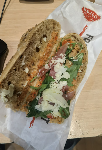 Pleased to find that this bakery serves vegetarian ciabatta to be heated up. First time I've found this but not visited for 9 years so France is beginning to understand the need for vegan and vegetarian food. We were able to get big glasses of English breakfast tea with milk and big glass of hot choc so impressed. Toilets were clean....