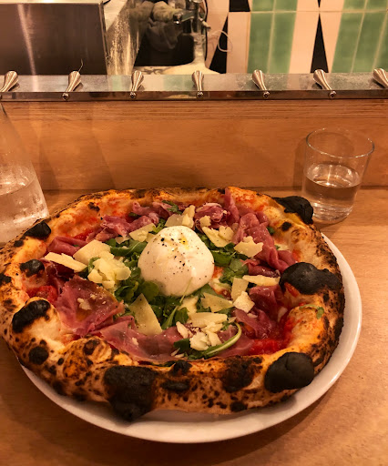 Pendant que nous attendons que les plats et boissons arrive, c'est la douche froide. On aperçoit de l'intérieur le sketch : plusieurs personnes viennent demander s'il reste des places, pour certaines la réponse est que c'est complet, qu'il faut repasser au prochain service. Pour d'autre, on leur propose la terrasse, ou le comptoir. D'autres arrivent encore après, on les refuse, puis d'autres encore qu'on accepte en leur proposant la terrasse. Alors finalement, la surprise est triste : on accepte et refuse les clients spontanés à la tête du client (bien habillés ? Touristes ?). Juste honteux. Rajoutez à ça un service minimum, une tension palpable entre les serveuses qui ont l'air d'être mises sous pression... et là arrive la pizza.
