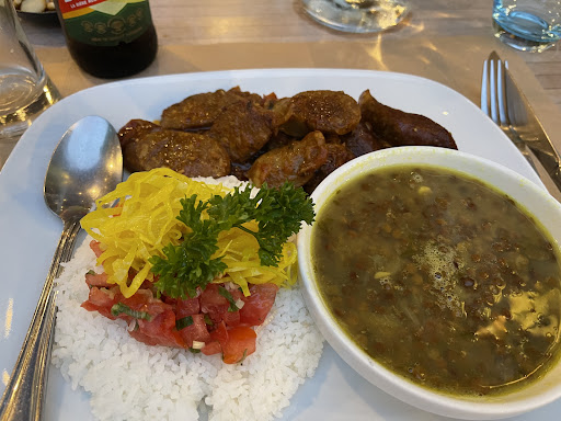 Read moreLa patronne est très sympa, semble aimer ce qu'elle fait et son ancien pays et elle explique très bien les différents plats. En revanche la serveuse n'est pas très agréable et un peu autaine. La cuisine était correct ( bonne cuisson des viandes, bon assaisonnement) mais nous avons été deçus car nous recherchions de l'exotisme et du dépaysement et cela n'a pas été le cas. De plus pas de pain pour pouvoir saucé : dommage... La carte ne propose pas beaucoup de choix mais à mon sens c'est le signe d'une cuisine faite maison. La sauce pimentée est pour une fois réellement forte ! Le restaurant est excentré du centre ville ce n'est pas très pratique mais 35 minutes de marche c'est pas mal pour digérer. Nous avons mangé en extérieur et le moins que l'on puisse dire est que cette petite cour a été bien pensée et...