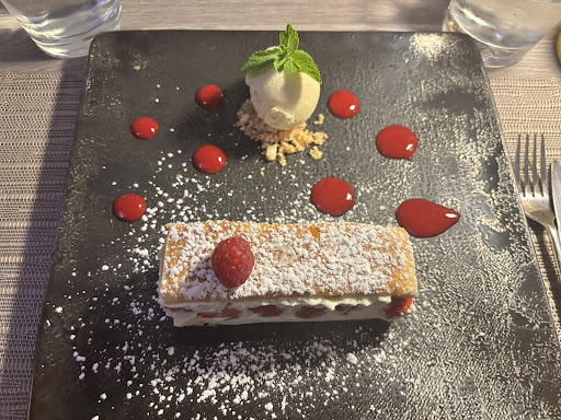 I had a combo menu, which was escargots in a puff pastry with spinach to start, chicken done two ways (flank in a white sauce and legs in a brown sauce) over mashed potatoes and vegetables as a main course, with a raspberry and strawberry Mille-feuille for dessert. My husband had the two-plate combo menu, which was lobster and prawns with eggplant tataki to start and a beef tenderloin over mashed potatoes with a nice gravy on top. It was SO delicious. We were able to see the menu in English from a QR code and the waiter spoke perfect English (and complimented our pitiful attempts at French - thank you for being patient!) so it was easy to know what everything was. I had a glass of wine with the meal and it complimented the meal perfectly. Altogether we spent about €90 for a great meal, including a tip. Great service and amazing food, I’d recommend this place to anyone...
