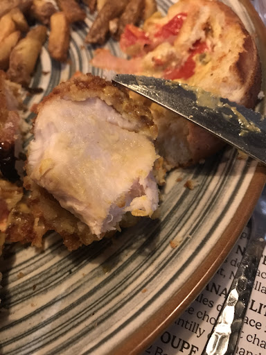 Service : Gros point noir. La dame qui nous a servit les boissons Ă©tait trĂšs aimable et souriante, elle a Ă©galement apportĂ© une gamelle a notre chien sans que nous n'ayons rien a demander. Mais le serveur... Ayant fait du service, je comprends qu'ils doivent ĂȘtre rapide, mais a ce point, c'est de l'impolitesse. Tout comme juger la cuisson de viande choisi par le client d'ailleurs. Si vous nous posez la question de comment nous l'aimons, ce n'est certainement pas pour nous dire deux fois que nous "perdons le goĂ»t de viande" en mangeant bien cuit, et que c'est "dommage." Merci de vous occuper de ce qui vous regarde. Vous apprendrez monsieur que lorsqu'on renverse le verre d'une cliente, on le lui remplace ou on le passe en gratuitĂ©. Mais on ne revient pas avec deux bouteilles pour remettre une dose de rhum, et une dose d'eau pĂ©tillante, Ă vu de nez, dans le mĂȘme verre. On ne se permet pas non plus de saisir la touillette pour mĂ©langer et "faire comme si de rien n'Ă©tait." Je n'ai pas retouchĂ© au mojito. Vous avez Ă©galement desservit la table de nos voisins. En repartant, toujours brusquement, tous les dechets que vous aviez sur votre plateau sont tombĂ©s sur mon fiancĂ© (Emballage de beurre individuel, gras de jambon...) Pas d'excuses, je crois que vous ne vous en ĂȘtes mĂȘme pas rendu compte. Comment auriez-vous pu ? Vous Ă©tiez dĂ©jĂ loin. A aller trop vite, on oublie les choses. AprĂšs 30 minutes d'attente, vous ĂȘtes finalement revenu nous dire que vous aviez oubliĂ© l'un des deux desserts. Nous avons eu nos plats dans les cinqs minutes qui ont suivi.