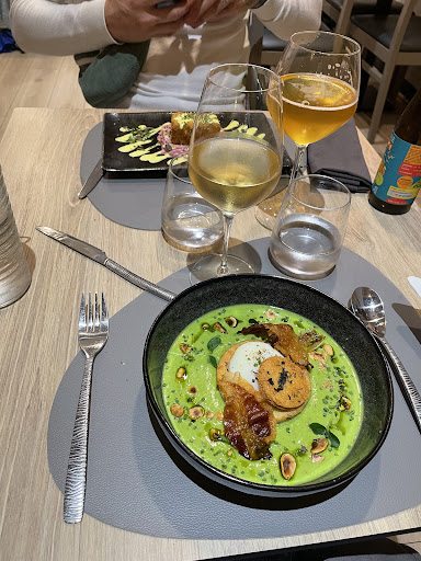 Read moreOn ne peut mettre une autre note que celle-ci. Nous avons eu le privilège de venir un soir plutôt calme, ambiance intimiste. Nous avons été très bien reçus par une jeune demoiselle très agréable, petit houmous de pois chiche vert offert à l’arrivée à la table. Que dire de la carte… un pur régal du début à la fin. Il y a de la recherche dans chaque confection, et une sélection particulière des produits. Les conseils pour les accords des vins étaient maîtrisés, avisés, bons échanges avec la serveuse qui était aux petits soins avec nous. Pas besoin de réclamer quoique ce soit, tout était anticipé. Mon coup de cœur ultime de la carte : le financier et ses déclinaisons de pistache. Exceptionnel. Félicitations aux cuisines. Merci d’avoir régalé nos papilles ce soir, merci pour votre accueil. Nous avons hâte...