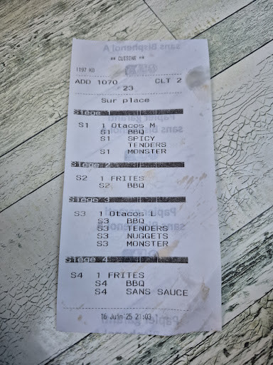 J'y suis allé avec ma femme, j'ai commander un tacos L avec nuggets + tendres, les nuggets étaient absent et en plus j'ai eu un tenders pimenté alors que j'ai bien préciser que je voulais un nature (ps le tacos était du coup une viande et non deux).