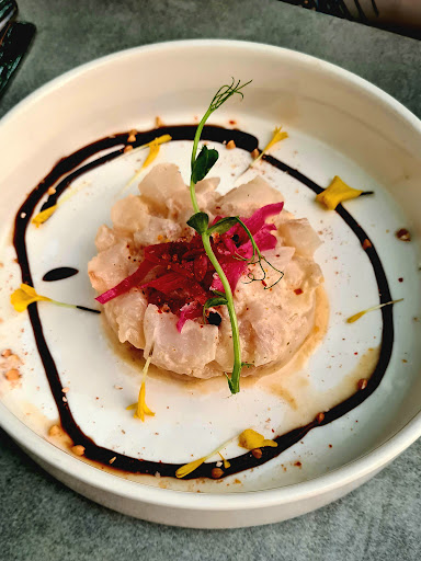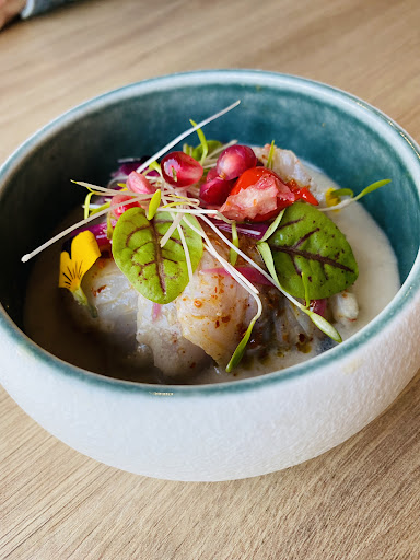 Les associations de saveurs sont originales, mais les portions sont insuffisantes (avis général sur une table de 8). Rapport qualité prix moyen (plat / dessert 29€). Côté service nous aurions apprécié avoir plus d'informations sur le menu découverte à double choix qui était plus que succinct, la serveuse n'a pas su répondre à nos questions, et le jeune serveur également, il serait bien de savoir ce qu'il y a dans les assiettes (chorizo servi avec la ballottine de lingue par exemple). Quand on demande qu'est ce que le rostello: "c'est du jambon à la truffe", mais encore? Une tranche de jambon dans l'assiette? Il faut insister pour avoir un peu plus de détails. Et cette entrée a d'ailleurs été très appréciée. Même remarque pour le dessert au pamplemousse "c'est autour du pamplemousse"... Dommage de ne pas laisser le petit pichet de sauce sur table pour l'agneau pour rehausser l'assaisonnement de la garniture à la carotte assez fade. La fondue de poireaux avec le poisson était quasiment inexistante. Globalement on reste sur notre faim (c'est le cas de le dire!) malgré que...