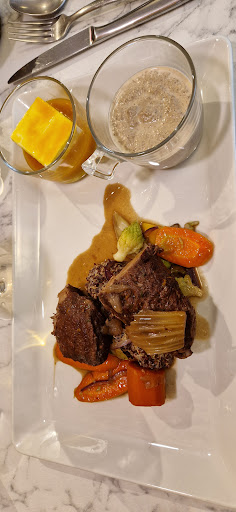 Read moreNous sommes tombé presque par hasard sur ce restaurant lors d'une déambulation dans les rues de Valence et ce fut une excellente idée que d'avoir poussé la porte. Joli restaurant cosy et confortable, les assises sont moelleuses et pour un bon repas c'est important. Nous avons pris directement le menu du jour donc pas d'avis sur la carte et ses tarifs. Le repas nous a été servi dans la même assiette, c'est très bien quand on n'aime pas attendre trop entre les plats. Nous avons mangé un velouté de champignons très bon, mais alors le veau qui suivait.... ouha !! Une cuisson basse température maîtrisée, une viande d'une finesse... pas besoin de couteau on pouvait presque la couper avec les yeux tellement elle était fondante !! Et les petits légumes d'hiver accompagnant étaient croquants et très bons tout comme le quinoa délicieusement parfumé.... un magnifique plat rempli de plaisir !! En dessert était proposé une panacota à la mangue ou fruits exotiques, je ne sais plus. Ce menu est à 17€, c'est incroyable ! On ne peut dire que "merci pour cet instant...
