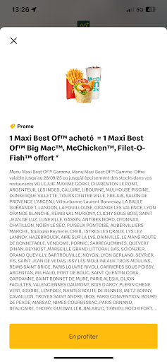 J’ai reçu une offre sur l’app McDo et quand je me suis déplacé dans le restaurant personne ne la connaissaient donc je passe par l’app pour en profiter celle ci propose de choisir entre : «livraison » « click & collect » et « sur place » mais seul la livraison ne marche, faisant passer l’offre de 8€ à 17€. Une offre totalement mensongère !