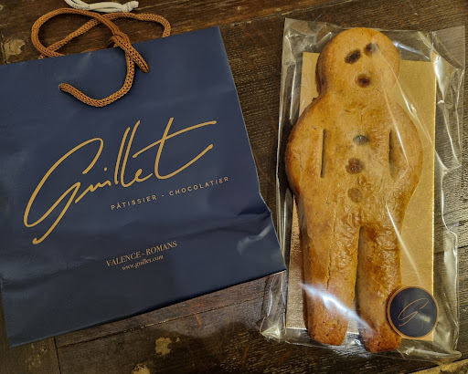 De passage à Valence, j'étais en quête d'une spécialité locale. Mes recherches m'ont menées à La Pâtisserie Guillet. Idéalement située face au Parc Jouvet, la boutique est immense, magnifiquement éclairée, et ses vitrines splendides sont remplies d'adorables coffrets de macarons et chocolats ; c'en est presque intimidant. Heureusement, ma gourmandise étant plus forte que ma peur de ne pas être à ma place dans ce lieu luxueux, je suis entrée. Et j'ai bien fait. Non seulement l'accueil a été absolument charmant, mais elle était là à m'attendre, la gourmandise convoitée : le Suisse Ce petit bonhomme d'aspect naïf rappelle un peu les mannele alsaciens. Mais ici la pâte est sablée et non briochée. Pensant en faire mon petit déjeuner et mon goûter pour le lendemain, j'ai choisi le format 300g (à 10,30€. Il existait aussi en 200g à 7€) En réalité, il n'a pas survécu au matin. Le vendeur m'avait pourtant prévenue : leur recette est la meilleure. C'est sans doute vrai. Aucune résolution de modération n'aurait pu tenir face à cette pâte fondante au goût d'amande et d'orange, subtilement aromatisée au rhum. Me voilà condamnée à tenter d'en refaire moi même, ou à revenir...