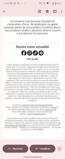 Le règlement a été effectué à l'accueil par le patron en personne. La somme totale était d'environ 180 euros. J'ai d'abord présenté les bons cadeaux '' menu enfant ''de mes trois enfants, ce qui a visiblement agacé le patron. J'ai ensuite voulu lui donner ma carte de fidélité, mais il l'a refusée, ce que je peux comprendre après la déduction des 30 euros sur notre facture. Mon mari a donc réglé les 150 euros restants. C'est à ce moment-là que je lui ai donné le code pour récupérer les trois paires de chaussettes. Le patron s'est littéralement braqué et refusé. Je lui ai alors rappelé qu'il était bien indiqué "sans obligation d'achat", mais il m'a coupé la parole en haussant le ton : « STOP, on ne va pas tout cumuler ! Ça suffit ! » Je peux comprendre son point de vue, mais il y a une manière de dire les choses !