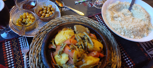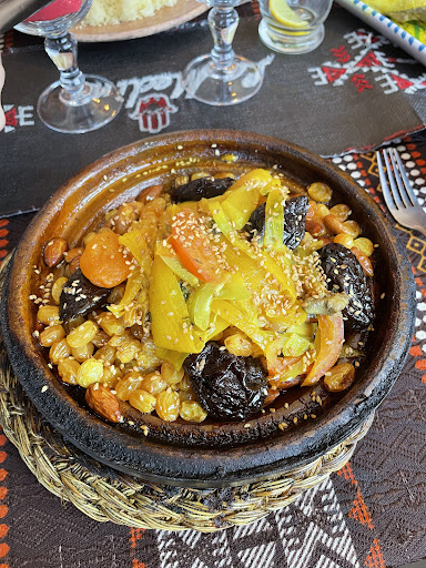 Donc je met une seule étoile car c'est très cher, mauvais, faible quantité, sans parler du service car le couscous tu dois le faire toi même, un plat de sauces de semoule et de raisins, pois chiche, harissa... On doit insister pour avoir suffisamment de pains pour deux tajines, au début on a eu trois minuscules miches de pains et on a du en redemander plein de fois. Le thé est bon, les glaces aussi honnêtement. Mais ce restaurant manque de respect à la...