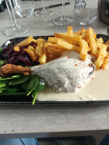 Restaurant testé en arrivant à 13h15. Généralement ça couine un peu. Ici, accueil parfait avec le sourire, tout naturel. Joli cadre , calme. Le plat, je me laisse tenter par le plat du jour. Cuisse de canard confite, crème d'ail. Et la , wahoo Canard bien confit. J'entends par la ,pas un truc qui sort d'une boîte et qui part en morceau. Non, ici belle texture, fondante à cœur et un beau croustillant la ou il faut. Servi avec de belles frites, un peu de paprika et surtout bien accompagné de sa fondu de chou rouge à l'anis étoilé et une salade avec des pousses d'épinard. La crème d'ail, qui peut faire peur à certaine personnes est onctueuse, bien équilibré et accompagne en douceur le plat sans prendre le dessus. On est au top. Un énorme merci à vous pour le service et gros bisous au cuistot. Tout cela pour 15€. 20€ avec une bonne bière, sérieusement, grand bonheur. Trouver des restaurants comme ça au hasard est...