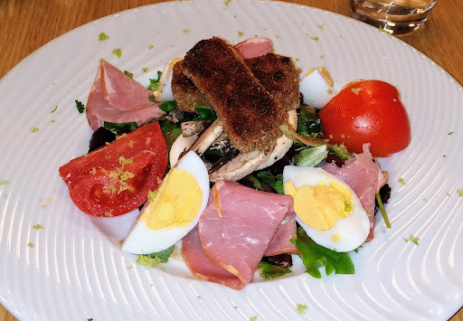 Tout d'abord l'entrée : Salade de tomme fermière panée - 7,90€ Entrée qui a peu d'intérêt, un simple salade avec bacon, tomates et 2 tout petits morceaux de fromage fondu et panées. Le fromage panée est intéressant mais la quantité est tellement minimum surtout pour le prix.