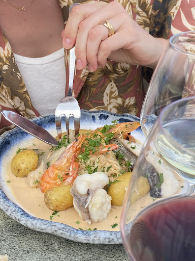 Côté assiette : Cuisine traditionnelle avec sa touche originale sur l'agrément des épices, des accras d'une finesse jamais rencontrée auparavant, roulé de saumon fumée à la crème très légère et bien agrémenté de ciboulette, ou des huîtres ou palourdes farcis. Pour le poisson du jour nous avons un lieu jaune travaillé à la sauce crémeuse avec patates douces violettes travaillé avec tandouri, pomme de terre grenaille, carottes nouvelles et pointes d'asperge vertes. Pour le dessert un financier moelleux à souhait à la pistache avec crème pâtissière