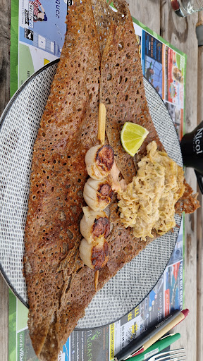 Read moreLe 16 d'août 2019, logeant sur le bono on nous conseille cette crêperie. Accueil sympa malgré la salle bondée et les serveurs qui courent en tous sens, on nous demande d'attendre un peu qu'une table se libère. Environ un quart d'heure plus tard, nous sommes accompagnés notre table toujours avec le sourire. Nous commandons 2 portos en apéritif, puis chacun une salade. Service assez rapide malgré le monde, mais salades avec justement peu de verdure justement (voir photos). Ma saumon st jacques comporte une petite quantité de salade variée (façon sachets de mélange de grande surface), 4 belles tranches de saumon, une tomate entière, une brochette de 4 st jacques, quelques asperges (en conserve) et une portion de poireaux cuits. Celle de mon mari même chose pour la salade et la tomate + farandole de charcuterie, jambon blanc, chorizo, andouille, poitrine grillée, paté hénaf, émincé de viande sautée. Idéal pour les amoureux de la viande. Nous n'avons rien pris de plus car petit appétit du aux grosses chaleurs. 37.10€ pour cette soirée salade porto, budget un peu plus élevé que dans d'autres établissements du même genre ou nous sommes allés, mais...