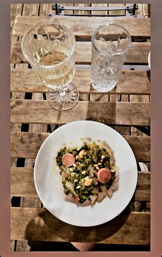 I chose this restaurant due to the good reviews and loving seafood. The restaurant is in a side street not far from the port. I was convinced we had come to the wrong place as it looks like a fishmongers, actually it is a fishmongers. However behind the scenes is a small enclosed restaurant. The waiter spoke excellent English and explained why their fish is tastier than any other. You choose from a tapas style entree and then you choose a fish for your main course from the fishmongers at the front. Price is per kilo so it can get pricey. However it is really worth it. We both chose blue fin tuna. It was cooked simply to absolute perfection. So so delicious. The tapas starters were fabulous too. All washed down with a lovely bottle of white wine. âŹ90 for two which considering the quality we thought it was worth it. So if youâre in Vannes and love fish this is a must and a true...