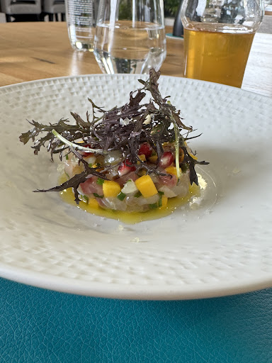 Read moreTrès belle façade. La promesse d'un très bon restaurant est là. L'entrée se fait face aux toilettes c'est un gros point noir sur l'idée qu'on se fait du restaurant par la suite. L'accueil est agréable et le service rapide et efficace. Par contre un va falloir refaire la carte et faire quelques chose de beaucoup plus simple et lisible et mettant le point sur les différentes catégories de menu et produits proposés. Le tartare de saumon était excellent, la terrine de poisson également. Les frites sont elles décevantes, des frites maison sont quand même pas dur à faire, surtout de nos jours, c'est un point qui permet de marquer la différence avec les autres restaurants. La viande était pas incroyable. La pana cotta était cependant excellente. Les portions. Sont quand même copieuse mais, pour un menu a 28 euros des frites maison et des morceaux de boeuf un peu plus noble sont attendus. C'est pas un mauvais restaurant mais c'est pas un endroit où l'on ressort...