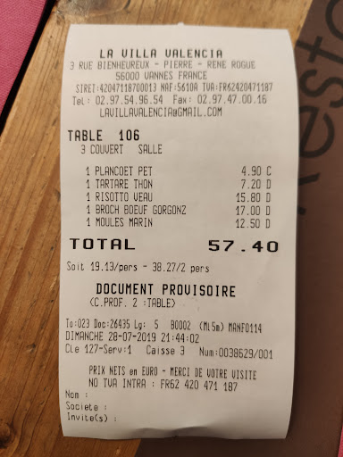Read moreHonteux Je m'y suis rendu hier soir,samedi 16 octobre, et je sois avouer que je. Suis encore bouche bée. Je suis avec ma femme, nous prenons un apéro,jusque ici tout va bien. Je prend l'entrée du jour,maquereaux fûmes salade pommes de terre tièdes..je me dis simple et efficace..sauf que mon assiette arrivé,et que les pommes de terre ne sont pas cuites, je renvois mon assiette, deuxième tour,même combat, du coup je retourne mon entrée en cuisine,demandant à la jeune serveuse sympathique de retirer cette entrée pour passer au plat. La, j'avais choisi une escalope de veau sauce gorgonzola, et ma femme une pizza légumiere veggie. Bon bah là encore, un problème de formation ou d'encadrement en cuisine se fait ressentir.. Mon escalope de veau,,bien que baignant dans une sauce peu ragoutante,est froide et sèche, et bien trop cuite...les frites étaient passablent, quand a la pizza de ma femme...pas mauvaise,mais aucune passion ni de goût dedans..digne d'une pizza de supermarché.. Bref, a un moment ,la petite serveuse gênée,appelle son responsable de restaurant.. La,un jeune homme courtois arrivé, prend note de mes réflexions, semble étonné ,puis s'enfuit quasi en courant,sans plus d'explications.. A la vue de l'amateurisme tant en cuisine qu'en salle de ce pseudo restaurant, je demande l'addition, en précisant qu'il n'était pas question pour moi de payer mon entrée ni mon plat,vu qu'ils étaient reparti en cuisine sans que je n'y ai touche...bref ..ils nous ont bien pourris notre soirée.. Mais pour couronner le tout,un curieux personnage a voulu quand même venir au conflit..moitié cuisinier, pâtissier, barman et plongeur je pense,mais qui semblait être le patron,ou pas??, Est venu me prendre de haut, par ce que oui,je suis chef de cuisine, et que je me suis permis de critiquer ..mais sa réponse...je fais 250 clients par jours ,donc vais pas m'arrêter à un commentaire..et de toute façon,cet toujours pareil me dit il,c'est toujours les gens du métier comme vous qui vous plaignez...bref...que dire de plus...la messe est dite....a oui il m'a aussi demandé de quelle région je venais...beaucoup trop de stigmatisation avec lui.. Bref, éviter ce restaurant à tout prix , la petite crêperie d'en face devait être 1000 fois mieux . Chez la villa Valencia...tout est mauvais...le cadre sur 3 étages types gros resto ,l'ambiance, le personnel encadrant,et les plats qui sont dignes d'un cuisinier qui ne se respecte plus lui même,donc qui ne pourra pas respecter ses clients en mettant un peu de passion dans...