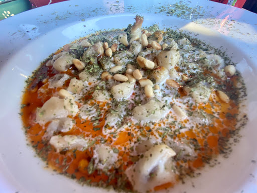 Turkish food at it's very best. Really loved this place, it's REAL home cooked authentic food, don't expect a huge welcome when you arrive, just go for the food. Only several (3) of the main courses were on when we went, which I expect is the norm ,but they were absolutely superb. The grand assiette starter is a selection of the starters, one between 2 is ample. The desserts are also to die for, we just asked for a small taster & he gave us a small selection between us. . 53 Euros for 3 courses & 2 glasses of red each...