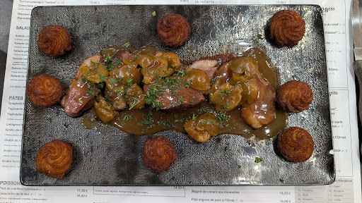 Really nice food and service. Most of us ate pizzas which were really good, and the magret du Canard, which was exceptional. One of us asked for a salad which was way too much, and the quantity of condiments compared to the quantity of lettuce was really disproportioned, we left more than the half because it was way too big. Also the pasta was nice, but maybe too much creme wich was a bit boring and too fat. But it's still a 4/5 regarding food and we really recommend it. The deserts were also good, specially the Damen Blanche and the banana split, but the tiramisu wasn't our favorite, it didn't have enough creme, and it had strawberry jam, which was a strange combination. Apart of that the service was nice, a bit slow, and the prices are well for...