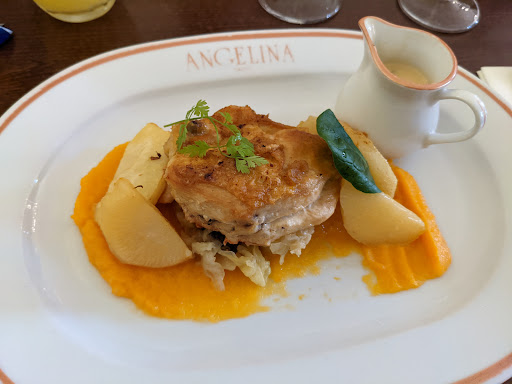 Read moreWent for Angelina (the restaurant, not the "bar") after touring the Grands Appartements in Versailles. The short version is: even though it's expensive we had a good time. Here's the long version... We didn't have high expectations, knowing Angelina is famous for desserts, but we were pleasantly surprised in the end. We had Supreme de Volaille (chicken), the Piece de Boeuf (Angus Beef), and the Ravioli aux Champignons a la truffe d'ete (Ravioli with mushrooms and summer truffle). Everything was delicious: filing but not too heavy, and we could taste all ingredients. Of course we had desserts too, but we didn't go for the classic Mont-Blanc: the Antoinette (Chou pastry, praline crunchy, chocolate cream, praline heart, whipped cream, dark chocolate disk, roasted hazelnut), the Rocher Praline (Hazelnut praline mousse, flowing hazelnut praline, praline crunch, almond-hazelnut dacquoise, milk chocolate whipped cream), and the Eclair-Misu (Chou pastry, mascarpone whipped cream, coffee jelly, speculoos crisp). There are very few places (that I've been to) that can rival with French pastries. Angelina delivered a decent meal and...