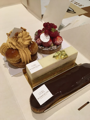 Le Saint-HonorĂ© Ă©tait une trĂšs bonne surprise. Nombreux sont les Saint-HonorĂ©s qui me déçoivent Ă Paris oĂč la pĂąte Ă choux est souvent sĂšche si elle n'est pas dĂ©trempĂ©e, avec parfois des opalines trop Ă©paisses ou trop durs qui sont plus dĂ©sagrĂ©ables qu'autre chose. Mais "Au Chant du Coq" a eu l'intelligence de n'en vendre que dans un temps limite, c'est-Ă -dire Ă partir de 11h00 et pas avant. Je reconnais bien lĂ l'esprit japonais plus attachĂ© Ă la qualitĂ© des produits qu'au cĂŽtĂ© commercial qui se moque parfois des clients. LĂ , on eu droit Ă un trĂšs bon Saint-HonorĂ© avec un touche de yuzu parfaitement dosĂ© pour apporter quelque chose en plus, des opalines fines comme je les aimes et une trĂšs bonne crĂšme. Enfin un Saint-HonorĂ© digne de ce nom qui est sans problĂšme parmi les meilleurs Saint-HonorĂ©s que j'ai pu dĂ©guster. đ
