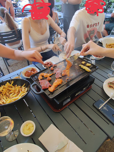 Côté cuisine, nous n'avons pas goûté la spécialité du restaurant (la pierrade, à noter que ce restaurant ne la sert pas sur une pierre, mais sur un grill en métal). Les prix sont très très chers pour la qualité et l'originalité de la carte (steak frites, poisson pâtes, cuisse de canard frites, escalope de veau pâtes) : entre 18€ et 36€ pour un plat chaud, ça fait très très cher pour un steak frites. Il manquait beaucoup de choses à la carte le jour où nous sommes venus, et nous n'en avons été prévenus qu'au moment où nous avons commandé :(