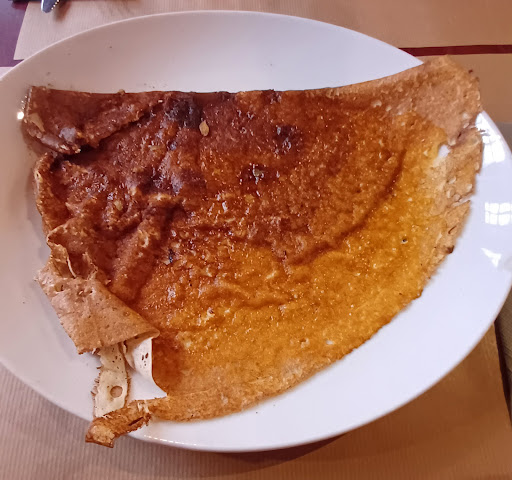 We found this little crepe shop a short walk down the street from Versaille. There is very limited seating in the restaurant, but they also have a few tables outside. We ordered the lunch special, which included a savory 'buckwheat pancake' and a sweet 'wheat flour pancake.' First, please note that if you order this special, only items with an asterik (*) can be ordered. Second, in America, when you talk about buckwheat flour and wheat flour, it means a dark, nutty, strong flavor. However, just as with the word "pancake" it must have been a mistranslation. They were delicious, light in flavor, and were definitely crepes, not American pancakes. There were 9 of us in our party, and there was not a bad crepe in the bunch. They were all huge and delicious. Most of us could not finish our sweet crepes because we were full. My only complaint is that the waitstaff was nowhere to be seen most of the time, and we were never given our drinks.
