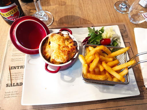 Not a very cosy restaurant, quite basic. In a nice town though and it has a decent terras with a nice view at the front. Service was good, the food however lacked in variation and flavour. My friend ordered the Flamiche ou Maroilles and it was literally a thick heavy bread, size of half a pizza, with cheese slapped on. And that was her main... The burgers were bland and the Poulet gratiné au Maroilles was chicken with cheese, nothing else. The vegetables I ordered as a side, were grated carrots and courgette heated up in a microwave or something. No flavour. So we would not recommend this...