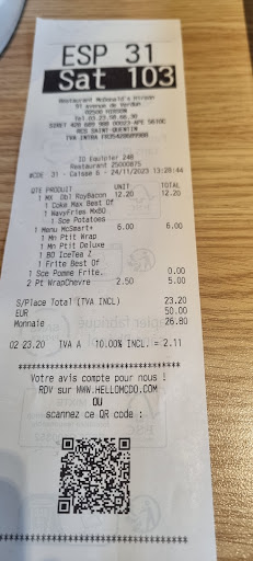 Read moreSi vous aimez les burger froid, les frites froides et môles cet endroit est fais pour vous ! C'est la troisième fois que je viens, et que je n'ai pas ce que j'ai commandé,j'ai commander deux menus mega big Mac, et en ouvrant le sac j'avais deux menus big mag simple, cette fois je fais demi tour et repasse au drive avec le sac complet, ils m'ont changé les burger, les boissons (car je l'ai demander pour qu'ils soient pétillant quand j'arrive à la maison !) , mais par contre, pas la présence d'esprit de me changer les frites ! Déjà à l'habitude c'est froid et tout mou, alors là après deux aller retour, tout bon à mettre à la poubelle ... Pas un geste commercial de proposé, un simple "désolé" .. Je ne suis pas du genre à dire du mal d'un commerce simplement parce que je n'aime pas, mais la c'est systématique, des erreurs, des menus manquants, qualités médiocre, étiquette dans le sandwich (oui oui, délicieux avec un peu de sauce giant), pour une si grosse enseigne ça le fais pas ! Bref, je n'irai plus, si vous voulez un conseil : aller dans le centre prêt du cinema y a un fast food de qualité et bien...