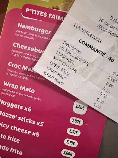 Read moreO Malo 70000 Pusey : repas vraiment pas bon , première fois que j’y suis aller avec un collègue et ce serra la dernière , Burger très acide les pain était toaster et sec ,les potatoes n’en parlons pas , le tacos cramé, frite à l’intérieur pas cuite fromage elastic , sauce acide , à ce demander si la date de certains produit n’étais pas dépassez , rien manger du tout , j’ai fais passez le message au cuisinier , il m’a répondue que C’était normal qu’il faisait ça tous les jours et que les gens étaient contents , que C’était moi qui aimais pas les produits et qu’il y avais aucun soucis , aucun geste n’a voulu être effectuer , de plus mon collègue a été servie 40 min avant moi , cela étais normal aussi alors que nous avions passez la commande en même temp heureusement que l’on étais pas 10 !...