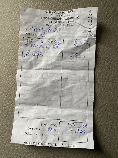 Read more1 des serveuses ne connaît pas la différence entre une bière bouteille et pression et ne sait pas ce qu'elle sert. Elle casse de la vaisselle et ne ramasse pas. On ne nous propose pas d'apéritif ni de vin. Avoir de beaux yeux ne suffit pas pour faire ce métier... 3 menus au choix avec salade/plat/dessert pour 22, 24 ou 26€. Menu à 24€ : Salade auvergnate : salade verte avec des croûtons du commerce, sans Cantal mais avec du bleu, pas de noix, 1/4 de tranche de jambon cru, vinaigrette trop huileuse. Plat pas exceptionnel mais réussi : Rôti de bœuf fondant avec sauce au poivre. Accompagnement pommes de terre bourratif et peu goûteux. Dessert : île flottante ou moelleux chocolat (plutôt un coulant qu'un moelleux) ou glaces avec Chantilly maison. Terrasse arrière sympathique mais non couverte, nous avons pris l'eau en milieu de repas. Grand parking derrière...