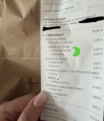 Read moreCommande passé sur uber eat,23 euros pour deux tacos avec boisson,commande non respecté j'ai demandé sans fromage pour cause d'allergie et mes deux tacos en contenais...Après 5 ou 6 appel j'arrive enfin à les joindres,l'erreur est humaine pas de problème mais la moindre des chose c'est de proposer un nouveau sandwich ou un remboursement immédiat pour l'erreur...Aucun remboursement sur Uber eat,la personne au téléphone me dit de repasser une prochaine fois pour un menu gratuit...c'est gentil mais moi en attendant j'ai payer 23 euros pour ne pas pouvoir manger se soir,tres decu,dernière commande...