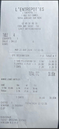 Read moreJ’y étais passé en août 2023. De nouveau de passage dans le secteur, je décide de m’y arrêter pour le déjeuner. Je suis assez étonné qu’il y ait autant de place alors que l’été dernier c’était complet tous les midi. La carte et le menu du jour sont toujours présents. Je prends le menu du jour Entrée/Plat/Dessert. 24€ Entrée du jour: terrine. Bon, elle a un joli nom sur le menu mais c’est clairement pas du maison !! Plat du jour: Moussaka. Très bonne rien à dire Dessert: Fromage blanc avec coulis… idem, à part le sortir du pot, on va pas dire qu’il y a une grosse préparation… Je prend également 1/2 San Pellegrino et un café… Là où il y a un pb c’est le tarif !! 3,5€ la 50cl d’eau et 2,2€ le café !! On est à Aubigny-sur-Nère !! Ne l’oublions pas !! Alors oui c’est pas mauvais, oui le service est au top, oui le cadre est sympa. Mais ça ne vaut pas 30€ !!! Je n’ai pas la confirmation mais ça sent le changement de...