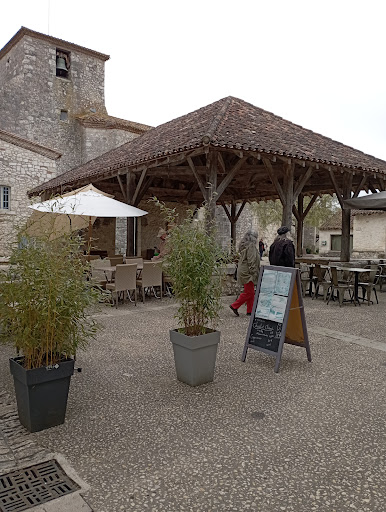 La terrasse n'est pas très grande, centre de village, dans le coin d'une rue étroite, et d'un espace sur la place entre le batiment et une halle en pierre et bois La place est difficile à gérer à l'extérieur, comme pour les autres restaurants, il y a beaucoup de table, mais on était finalement bien installé, y a de la place quand même pour passer et s'installer, notre table était couverte