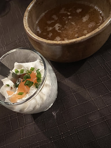 Nous commandons d'une traite notre boisson, nos entrées et plats, à 20h50. L'arrivée d'une verrine par personne mousse citronnée avec son saumon a fait son effet !