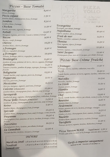 Je me permets de partager les tarifs des pizzas (introuvables sur internet et j'ai trouvé que ça manquait). il y a également des pâtes et Bruchettas au verso du menu.
