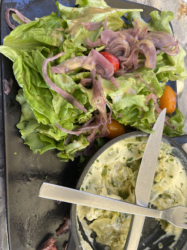 Salade décevante. 3 petits bouts de jambon crus, 4 minuscules camembert panés industriel et 18 litres de vinaigrette fortement et mal assaisonnée (et pourtant j'aime ce qui arrache mais quand c'est bien fait 🤣), le tout essayant de recouvrir le champ de salade. Ah là c'est sur c'était copieux de verdure.