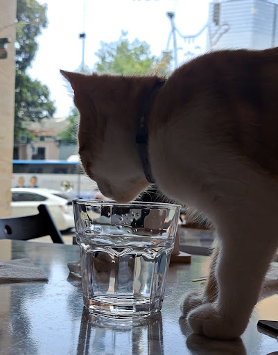 Another concern: the adult cat is allowed to go outside freely and then return to the café. Meanwhile, the kittens are not allowed out. This seems risky - a cat that roams outdoors can easily bring in infections, parasites, or insects into the indoor café space, where people are eating. The adult cat was lounging on various seats, and the kittens were jumping on tables. One of them even drank from my glass.