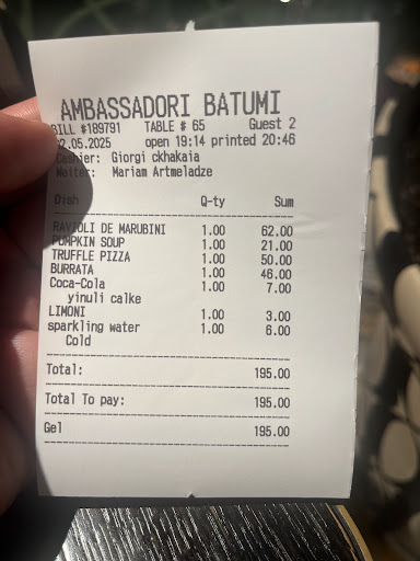 From the moment you step into Restaurant Ambassadori in Batumi, you are welcomed into an atmosphere of elegance and warmth. The ambiance is simply perfectâchic yet cozy, offering a sense of comfort and luxury at the same time.