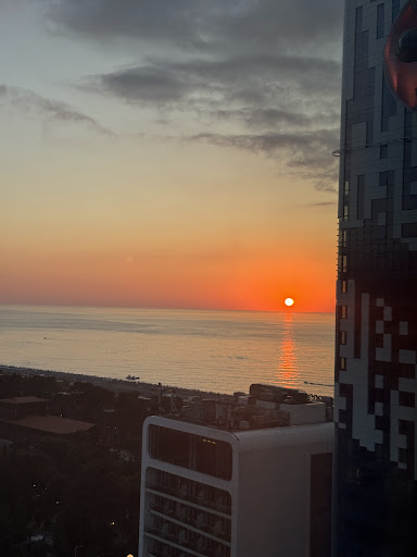 This place is just not worth it. I had this restaurant bookmarked on my maps for the last half a year and decided to visit it on my anniversary with fiancee. We ordered 2 cocktails and 3 meals. Cocktails were the only thing that was good at this place besides the looks from the window. We ordered dragon roll - sushi were small and untrimmed on the sides. I didn’t expect to see this type of rolls in a restaurant like this. The taste is average, and there’re a lot of better places if you want Japanese sushi in Batumi. Spring rolls - they were falling apart, because it’s cut with a knife on the kitchen. So it was hard to eat them and taste was also average. Then we had a main dish: I had chilli chiken ramen, and my partner had thai red curry. Red curry was mid, it didn’t had a taste of curry at all, it was reminding a tom yum but with ingredients like bell peppers, eggplants, etc. Ramen was a disaster. They brought it in a big bowl that was filled less than half. It looked like a joke. Chicken was dry, noodles didn’t even close look like it was homemade. It reminded me of supremo pasta from 2 nabiji for 3 lari. And I was surprised to see there crab sticks. To be clear, it’s just a parody of a ramen, that was ok to serve in 2000’s, but now? And the last part is their service. We were waiting for our dishes almost 1 and a half hour., even though restaurant was half empty. When you leave a check of 100 dollars for 3 dishes at least you expect that waiters won’t place clean bowls on top of dirty plates with dirty napkins on it. Then the music started playing. There were live music, of course no one told us, and as far as we had a special day we wanted to enjoy each others company, but the loudness of the music didn’t allow us to communicate. So we left. DO NOT GO THERE until you want to make a city panorama photos...