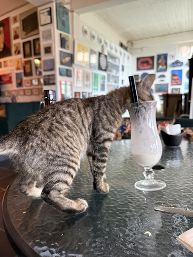 The view is very nice. But the identical view can be had at Betlemi Rise (google has it), for free, bring you own coffee and cookies. The flock of cats and their playful antics is amusing. Service was fast and friendly. WC clean and working. Decor well done, lively and interesting. The bench/tables outside are very comfortable, clean, cushions everywhere. There is a table time-limit during the day, understandable. Reservations surely required at night. The location is 144 steps (give or take a few) straight up from the street, but easy to find, signage is clear, stairs well made. The only complaint...