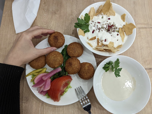 Honestly... 1) āFattehā is just a plain yogurt from can mixed with chickpeas, it had no flavor at all, no salt, no black pepper, no garlic flavor, no cumin flavor. May be they forgot to add spices, I donāt know. Dish tasted just like plain yogurt from package. In menu says that dish has nuts, but I didnāt find any. I didnāt enjoy dish at all. 2) āFalafelā had no flavor either, plain deep fried chickpea-balls, no falafel spices were added, it had no flavor, even no salt. Marinated veggies on a plate were too acidic , I couldnāt eat it. 3) Place looks like they just opened and interior is not finished. It is very small, looks empty and not cozy at all. No decorations, extremely simple furniture, no plants.