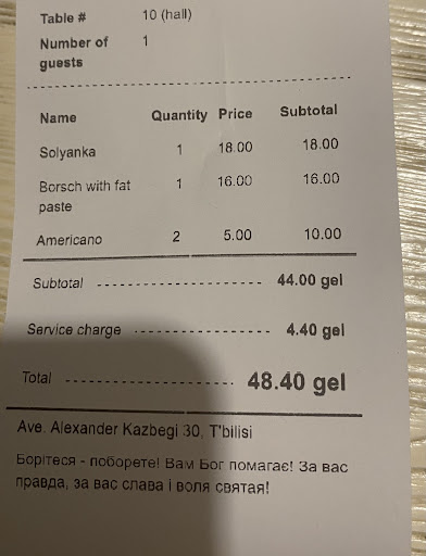 Read moreWe tried Solyanka and Borscht + coffee which was good actually! The atmosphere is pleasant, food was delivered fast. Solyanka was tasty, the meat wasn’t perfect but not bad. Borscht was also tasty but the meat pieces were very, very thin and hardly could feel meaty taste. Ot was more light version. Both, overall were good enough and we were still happy we visited. The downside was that we didn’t find Solyanka on the menu and didn’t know the price, had to additionally ask if it’s even available, just found out it was supposed to be there via the internet. I also asked if everything comes with bread and they said yes but bread came along either only with Borscht or it came along only with two tiny pieces. The bread also tasted a bit old. Overall, I recommend this place despite its...