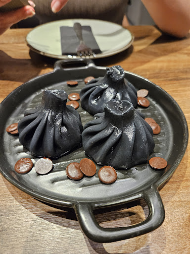 Khinkali: We had fried lamb, spinach, shrimp, chocolate, and beans. All the khinkali have no liquid inside, just dough and filling. The liquid is apparently not gained through sweating of the contents, meaning, for example, the spinach is placed fresh in the dough casing. Hereās our tip: marinate the spinach, heavily season it (at least with some salt & pepper), and freeze it with liquid. Then cook this spinach cube with the dough casing. This way, the liquid remains. Otherwise, itās just dough with filling. Fried lamb tastes only of oil. Horrible. Spinach is weakly seasoned and in a dough casing that differs in color from the spinach. Beans are interestingly spicy. Shrimp are also seasoned. Chocolate is outrageous. Chocolate means industrial Nutella-cream. The dough is black but tasteless (tip: use vanilla, cinnamon, or cardamom in the dough). Each khinkali comes with a dip, which is bland and industrial.
